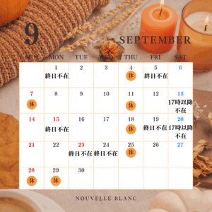 お手数ですが、化粧品購入などのご来店は下記の不在日をご確認の上ご来店ください。