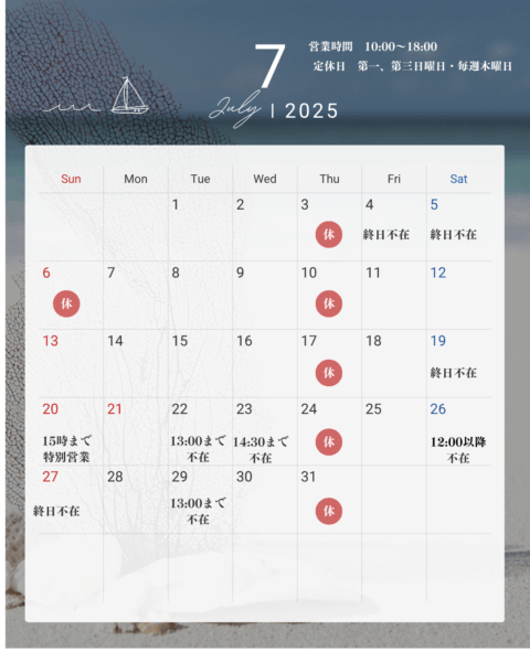 ホームページのお知らせ欄の月のスケジュールをご確認頂きご来店くださいませ。
