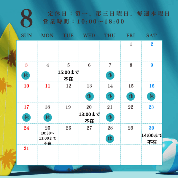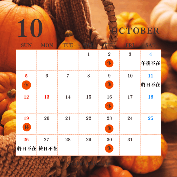 お手数ですが、化粧品購入などのご来店は下記の不在日をご確認の上ご来店ください。